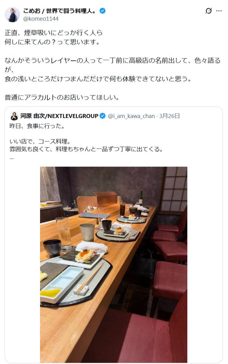この投稿には元ブレイキングダウン選手で、現在は割烹料理店を経営するこめおが「正直、煙草吸いにどっか行く人ら 何しに来てんの?って思います。なんかそういうレイヤーの人って一丁前に高級店の名前出して、色々語るが、 食の浅いところだけつまんだだけで何も体験できてないと思う。 普通にアラカルトのお店いってほしい」と、引用リポストし、私見を述べている。